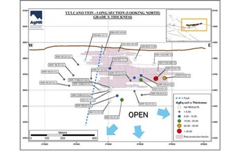 Figure 4 Longitudinal section showing grade thickness values on the Vulcano vein - AgEq values are calculated using parameters described for Table 1 (CNW Group/Silver Mountain Resources Inc.)