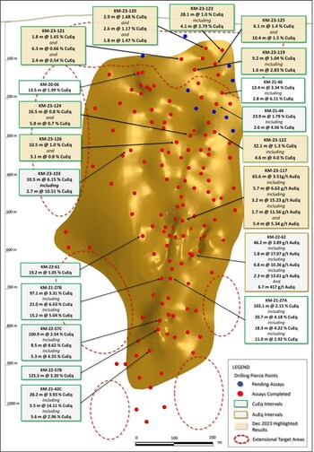 • Hole KM-23-123, part of the shallow drilling program at the Kay Deposit, returned 28.1 m at 1.0% CuEq, including 4.1 m at 2.8% CuEq. This shallow hole added considerable volume to the Kay Deposit, stepping out 160 m above hole KM-23-114 and 45 m south of KM-23-120.