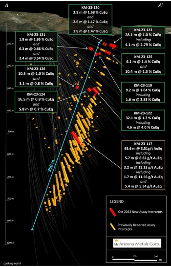 Arizona Metals Intercepts 65.6 m at 3.5 g/t AuEq (incl. 5.7 m at 6.6 g/t AuEq) at the Kay Mine Deposit; Western Target Deep Drilling hits 1.8 m at 1.8 g/t Au and 1.5 m at 2.1 g/t Au