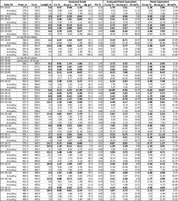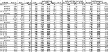 The true width of mineralization is estimated to be 50% to 99% of reported core width, with an average of 76%. (2) Assumptions used in USD for the copper and gold metal equivalent calculations were metal prices of $4.63/lb Copper, $1937/oz Gold, $25/oz Silver, $1.78/lb Zinc, and $1.02/lb Pb. Assumed metal recoveries (rec.), based on a preliminary review of historic data by SRK and ProcessIQ1, were 93% for copper, 92% for zinc, 90% for lead, 72% silver, and 70% for gold. The following equation was used to calculate copper equivalence: CuEq = Copper (%) (93% rec.) + (Gold (g/t) x 0.61)(72% rec.) + (Silver (g/t) x 0.0079)(72% rec.) + (Zinc (%) x 0.3844)(93% rec.) +(Lead (%) x 0.2203)(93% rec.). The following equation was used to calculate gold equivalence: AuEq = Gold (g/t)(72% rec.) + (Copper (%) x 1.638)(93% rec.) + (Silver (g/t) x 0.01291)(72% rec.) + (Zinc (%) x 0.6299)(93% rec.) +(Lead (%) x 0.3609)(93% rec.). Analyzed metal equivalent calculations are reported for illustrative purposes only. The metal chosen for reporting on an equivalent basis is the one that contributes the most dollar value after accounting for assumed recoveries.