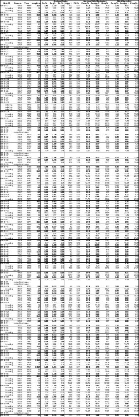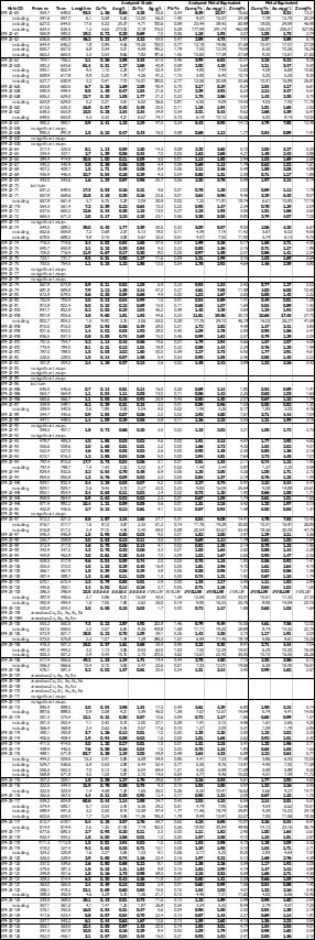 Gold content was determined by fire assay of a 30-gram charge with ICP finish (ALS method Au-AA23). Silver and 32 other elements were analyzed by ICP methods with four-acid digestion (ALS method ME-ICP61a). Over-limit samples for Au, Ag, Cu, and Zn were determined by ore-grade analyses Au-GRA21, Ag-OG62, Cu-OG62, and Zn-OG62, respectively.