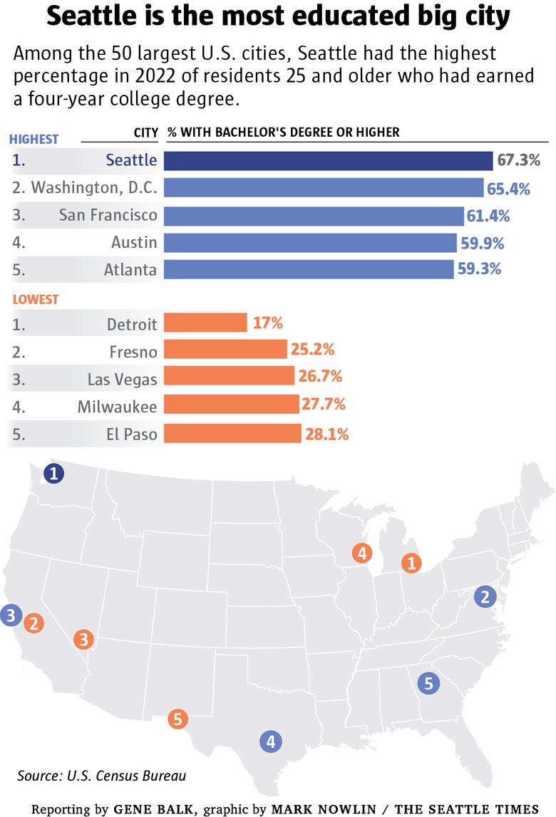 Even compared with other large cities, Seattle stands out. Among the nation’s 50 most-populous cities, Seattle ranked No. 1 for the percentage of the 25-and-older population with a college degree in 2022. Washington, D.C., was No. 2 at 65%, followed by San Francisco at 61%.