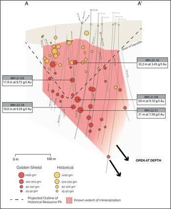 Mazoa Hill and Diamond Drilling Campaign Over 30,000m of drilling has taken place at Mazoa Hill, intersecting high grade gold mineralization to a vertical depth of approximately 400m with hole MH-23-33 (13.70m grading 2.28 g/t gold including 3.00m grading 7.64 g/t gold), the final hole of Golden Shield's 2022 diamond drill program. Golden Shield has systematically stepped out and traced the high grade "ore" shoot to approximately 180m beyond the previous pit limiting shell and the mineralization remains open below the base of all drilling at a vertical depth of approximately 400m. As depth to the target increases below this, the drill cost to test it for each intercept in step out drilling becomes progressively more expensive (See Figure 2 and 3).