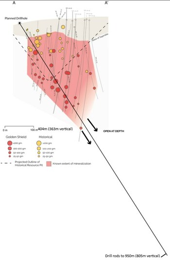 Figure 3. Mazoa Hill Long Section (CNW Group/Golden Shield Resources) Figure 4. Mazoa Hill Long Section with proposed drill hole (maximum depth). (CNW Group/Golden Shield Resources)