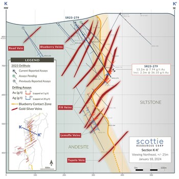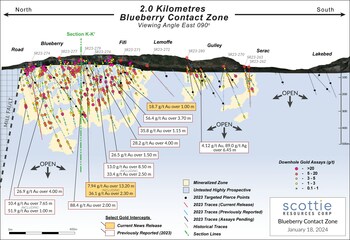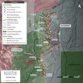 VANCOUVER, BC, Jan. 18, 2024 /CNW/ - Scottie Resources Corp. ("Scottie" or the "Company") (TSXV: SCOT) is pleased to report new assays on the Blueberry Contact Zone in British Columbia's Golden Triangle, including several high-grade intercepts through the Fifi and Lemoffe vein zones along the Blueberry Contact. The Blueberry Contact Zone is located 2 kilometres north-northeast of the 100% owned and royalty free, past-producing high-grade Scottie Gold Mine, 35 kilometres north of the town of Stewart, BC, along the Granduc Road.