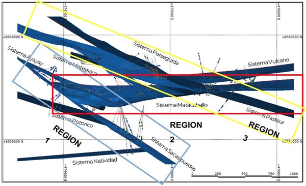 | Mineralized veins have been subdivided into three vein systems, or regions. Regions 1 and 3 are mainly NW-SE striking structures, while Region 2 are E-W veins parallel to the Matacaballo vein. Figure 1 shows the distribution of the veins into the three Regions. Region 1 includes the Ayayay, Sacasipuedes, Natividad and Pozo Rico veins, all located on the western and southwestern sections of the Reliquias Mine and all subparallel, except for the NAT vein. Region 2 includes the Matacaballo, Sorpresa and Vulcano veins, roughly aligned in an E-W corridor centered around the MTC vein. Region 3 includes the Meteysaca, Pasteur and Perseguida veins, located on the eastern sector of the vien system.