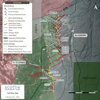 VANCOUVER, BC, Feb. 7, 2024 /CNW/ - Scottie Resources Corp. ("Scottie" or the "Company") (TSXV: SCOT) is pleased to report final assays on its 2023 drill campaign on the Blueberry Contact Zone in British Columbia's Golden Triangle, including intercepts of 13.9 g/t gold over 7.00 metres and 59.2 g/t gold over 1.25 metres. The Blueberry Contact Zone is located 2 kilometres north-northeast of the 100% owned and royalty free, past-producing high-grade Scottie Gold Mine, 35 kilometres north of the town of Stewart, BC, along the Granduc Road.
