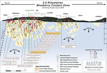 President and CEO, Brad Rourke commented: "2023 was another exceedingly successful program for Scottie. Results from the program have expanding the known mineralization at Blueberry in multiple directions, particularly at depth where we extended mineralization by 125 m to a total depth of 525 m. We also had fantastic results at both the D -Zone and at the Scottie Gold Mine, both targets showing great upside potential for future expansion. The additional data provided through drilling has greatly improved our understanding and modelling of the Blueberry Contact Zone and will facilitate enhanced targeting of high-grade zones moving forward."
