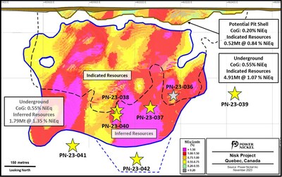 Figure 1 : Fall 2023 drillhole intersections against the MRE 2024 NiEq grade distribution. (CNW Group/Power Nickel Inc.)