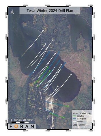 Figure 5- Plan view of winter 2024 planned drill collars and traces, looking NE. Holes are designed to test the potential extent of Tesla and provide addition intersections for the newly-discovered Bridge Zone (CNW Group/Foran Mining Corporation)
