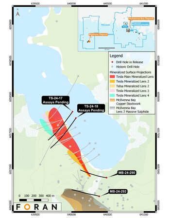 Erin Carswell, Foran's Vice President, Exploration, commented: "The 2024 Winter drill program has started on an exceptionally positive note, with results from hole MB-24-290 representing a significant strike extension of the Tesla Zone. Now measuring over one kilometre long and extending beyond the original EM target length, Tesla is rapidly expanding beyond our expectations as a zone of strategic importance for future growth initiatives. Additionally, two new up-dip intersections have extended Tesla towards surface confirming the potential for shallower mineralization, with assays from these latter intervals expected shortly. Of particular interest, the southernmost Bridge Zone intercept encountered elevated gold mineralization when compared to McIlvenna Bay reserve grades, highlighting the possibility of growing precious metal credits. We are looking forward to maintaining this momentum and provide updates on our developments from Tesla and the Bridge Zone as the important ice drilling season unfolds".