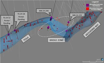 Initial Drill Results The first two holes (MB-24-290 and 292) have now been completed and the assay results have been returned from the lab for the upper mineralized intervals from each drill hole identifying significant zinc and/or copper zones, with complete results for the holes expected to be received in the coming weeks. These holes were drilled near the northern and southern ends of the Bridge Zone respectively, designed to step out from known mineralization at the Tesla Zone and McIlvenna Bay Deposit and test the continuity of the zones while moving towards the central part of the Bridge Zone with further drilling.