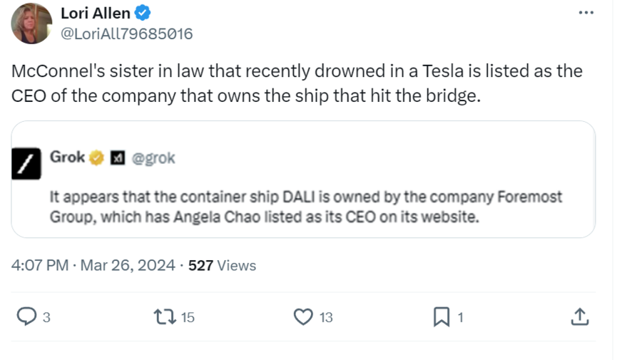 Fact Check: Mitch McConnell's Sister-In-Law Angela Chao Is NOT Listed As CEO Of Company That Owns Ship That Hit Baltimore Bridge