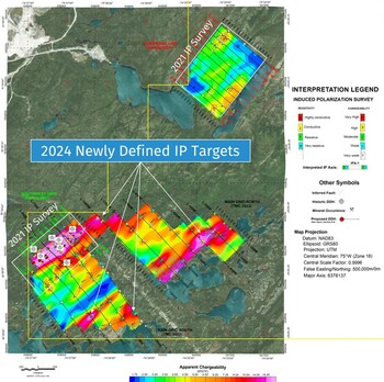 The identified anomalies exhibit high chargeability and low resistivity with complex shapes, spanning apparent widths of 50 to 400 metres. These anomalies, centered on the strong conductor, extend over 900 metres in some areas along the strike. The grid was designed to examine the overlapping geochemical and geophysical anomalies around the 2021 IP survey's extension and vicinity.