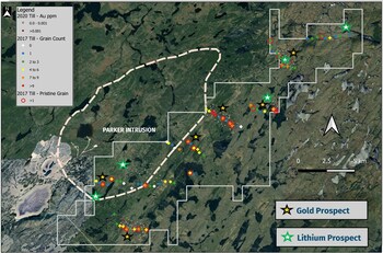Compilation and Review of Historical Data on Troilus East Over the past months, Comet Lithium has recompiled historical data on its Troilus East property, allowing the team to identify several highly prospective areas. The review of historical programs, which included mapping, till sampling in 2017 and 2020, drilling of eight holes totaling 1,560 metres, IP survey results from 2021 and 2023, and a high-resolution magnetic survey from 2018, identified multiple new priority target areas. The first target area is defined by samples with an elevated number of gold grains, several of which were classified as "Pristine". The second target area is marked by anomalous and coincident gold values in till. These targets are located along a northeast-southwest trend along the contact with the Parker Intrusion (please refer to figure 4 below). A detailed follow-up geochemical survey and prospecting effort covering both priority areas is planned for this summer. Additionally, a larger, property-wide survey is planned to fill in areas where no till sampling was previously conducted.