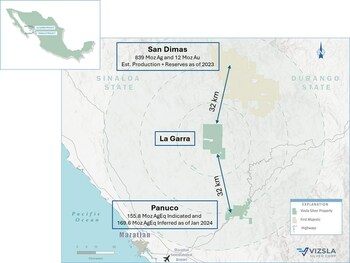 VANCOUVER, BC, March 28, 2024 /CNW/ - Vizsla Silver Corp. (TSXV: VZLA) (NYSE: VZLA) (Frankfurt: 0G3) ("Vizsla Silver" or the "Company") is pleased to announce that it has entered into an agreement to acquire the past-producing La Garra-Metates district (the "La Garra-Metates District" or "La Garra") situated in the heart of the silver-gold-rich Panuco – San Dimas corridor. Reconnaissance work conducted by Vizsla Silver's geologists shows the presence of at least two vein systems with respective strike lengths of 2.6 km and 1.8 km carrying significant silver and gold grades.