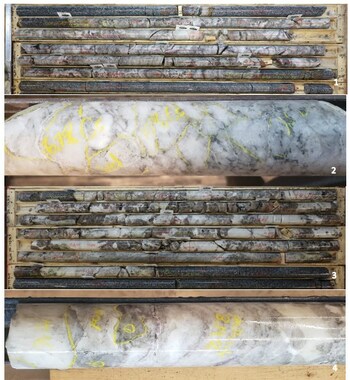 Figure 1 – Power Metals CEO, Haydn Daxter with Winsome VP Exploration Antoine Fourier, and Power Metals VP Exploration Amanuel Bein (R-L) (CNW Group/POWER METALS CORP) Figure 2 – West Joe drill core with coarse grained spodumene and pollucite mineralization, (images 1-2) Drill hole PWM24-172, (images 3-4) Drill hole PWM24-177 (CNW Group/POWER METALS CORP)
