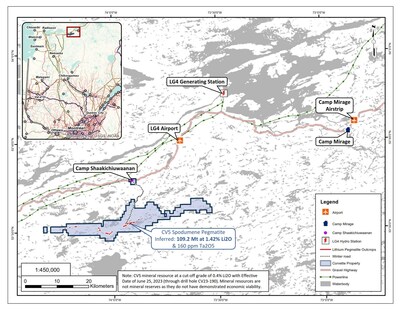 1 The CV5 mineral resource estimate (109.2 Mt at 1.42% Li2O and 160 ppm Ta2O5 inferred) is reported at a cut-off grade of 0.40% Li2O with effective date of June 25, 2023 (through drill hole CV23-190). Mineral resources are not mineral reserves as they do not have demonstrated economic viability.
