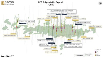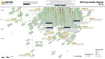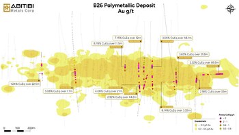 About Abitibi Metals Corp: Abitibi Metals Corp. is a Quebec-focused mineral acquisition and exploration company focused on the development of quality base and precious metal properties that are drill-ready with high-upside and expansion potential. Abitibi's portfolio of strategic properties provides target-rich diversification and includes the option to earn 80% of the high-grade B26 Polymetallic Deposit, which hosts a historical resource estimate1 of 7.0MT @ 2.94% Cu Eq (Ind) & 4.4MT @ 2.97% Cu Eq (Inf), and the Beschefer Gold Project, where historical drilling has identified 4 historical intercepts with a metal factor of over 100 g/t gold highlighted by 55.63 g/t gold over 5.57 metres and 13.07 g/t gold over 8.75 metres amongst four modelled zones.