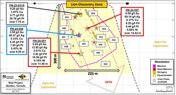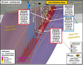The Company's Winter 2024 drill program ended with 15 successful holes at the Lion Discovery. Additional assays to be released when received shortly could evidence ongoing progress on the significant discovery that has been made (see Figure 1 below). Power Nickel will continue to drill at the Lion Discovery in the upcoming summer season, following up PN-24-051 (this release) and PN-24-062, the deepest mineralized intersections to date.
