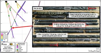 Figure 3: Core picture of hole PN-24-051 showing the strongly mineralized intervals and its location on a vertical cross-section view looking ENE along holes PN-24-047 and PN-24-051. (CNW Group/Power Nickel Inc.)
