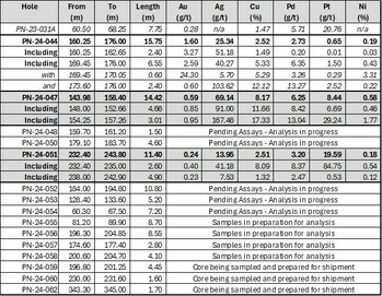 14.42 m of 0.59 g/t Au, 69.14 g/t Ag, 8.17% Cu, 6.25 g/t Pd, 8.44 g/t Pt and 0.58% Ni