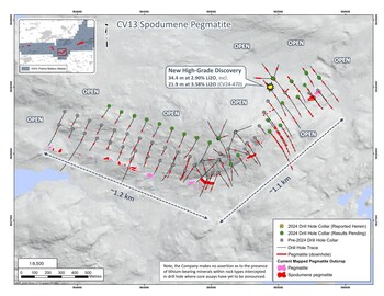 Darren L. Smith, Vice President of Exploration for the Company, comments: "To put it mildly, the team is very excited about this new high-grade discovery at CV13, which is open in multiple directions and broadens our view on potential in the area significantly. This hole (CV24-470) is the widest, most well-mineralized drill hole to date from CV13 and includes multiple samples over 5% Li2O. This discovery was made at the tail end of the program; however, we were able to follow-up with multiple additional holes prior to break-up. We are eagerly awaiting the assay results from these follow-up drill holes as we work to refine the geological model ahead of a maiden MRE at CV13, on track for Q3 2024."