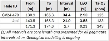 - 34.4 m at 2.90% Li2O, including 21.9 m at 3.58% Li2O (CV24-470).