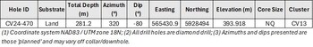 - The 2024 winter drill program (now complete), totaled 62,518 m (166 holes), including 50,961 m (121 holes) at CV5, and 11,557 m (45 holes) at CV13, of which 46,651 m (131 holes) remain to be reported – 35,375 m (87 holes) at CV5, and 11,276 (44 holes) at CV13.