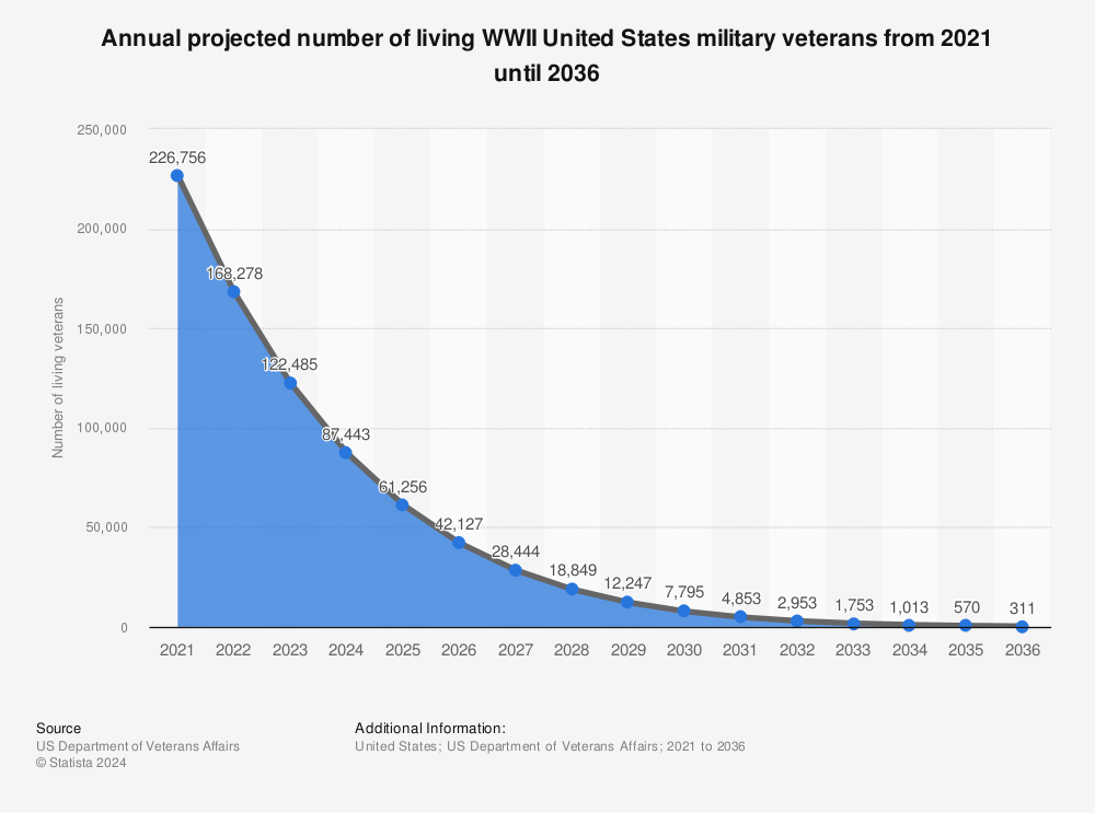At average compensation and medical care cost of $35,000 per beneficiary, the total cost would be $1.2 billion currently and barely $10 million per year by 2035 when only 311 WWII vets are projected to remain.