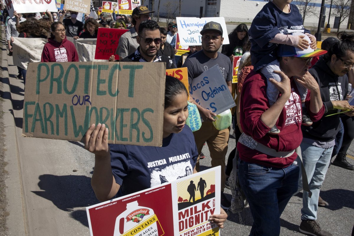 Farm workers march to a Hannaford supermarket to protest the chain's refusal to purchase milk from dairy suppliers who have committed to a set of fair labor practices, May 1, 2022, in Burlington, Vermont. One... More ANDREW LICHTENSTEIN/CORBIS VIA GETTY IMAGES