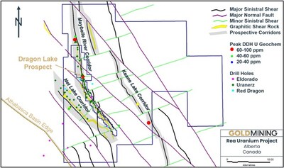 Figure 2. Three northwest trending corridors – Net Lake, Maybelle River and Keane Lake – were outlined based on interpreted major sinistral shear faults and associated graphitic shear rock. These corridors are offset by younger northeast striking sinistral shear faults, which is an important control to localizing uranium mineralization at the Dragon Lake prospect.1 (CNW Group/GoldMining Inc.)