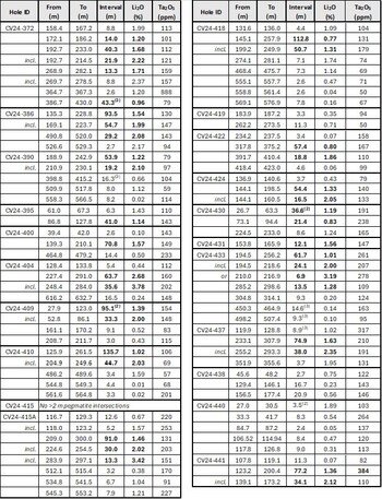 • 64.7 m at 2.15% Li2O, and 53.7 m at 1.58% Li2O (CV24-467).