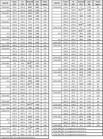 Core sample assays for drill holes reported herein from the CV5 Spodumene Pegmatite are presented in Table 1 for all pegmatite intersections >2 m. Drill hole locations and attributes are presented in Table 2.
