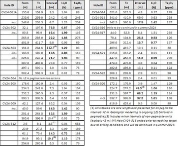 • 124.9 m at 1.72% Li2O, including 13.4 m at 4.04% Li2O (CV24-473).