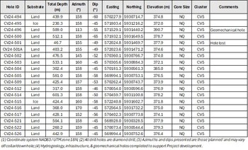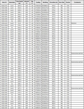 • At CV9, geological modelling is ongoing on a hole-by-hole basis and as assays are received. However, current interpretation indicates CV9 is comprised of a single principal dyke, which outcrops at surface, has a steep northerly dip, and is moderately plunging to the east-southeast. A strike length of 450 m has been delineated through drilling and outcrop.