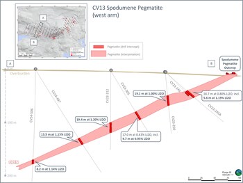 A follow-up drill program at CV13, focused on further delineation of the high-grade Vega Zone, is currently underway as part of this summer-fall drill program. Approximately 10,000 m of drilling is under consideration targeting the CV13 Spodumene Pegmatite's Vega Zone and the immediate corridor eastwards towards the CV5 Spodumene Pegmatite.