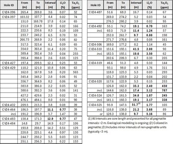 Table 1: Core assay summary for drill holes reported herein at the CV13 Spodumene Pegmatite.
