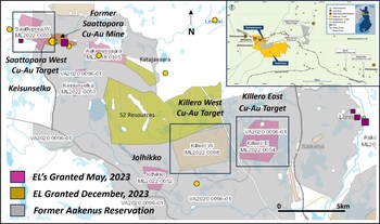Capella's Northern Finland Copper-Gold Project consists of 5 exploration licenses ("EL's) with granted drill permits, and is located in the world-class metallogenic province of the Central Lapland Greenstone Belt ("CLGB") (Figure 1). The portfolio consists of the priority Killero E and Killero W targets (former Anglo American plc Base of Till – or "BoT" - copper-gold geochemical anomalies which were never drill tested), Saattopora W (the interpreted western extension of Outokumpu Oy's former Saattopora copper-gold mine), and two conceptual gold and copper targets (Keisunselka and Jolhikko)(see Company News Release dated December 5, 2023).