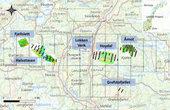 Figure 3. Key targets at the Løkken copper-cobalt-zinc project. Areas of completed ground magnetic surveys and soil grids are also indicated.