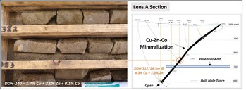 Figure 4. High-grade copper-cobalt-zinc mineralization at Hessjøgruva and long section of main mineralized horizon. (CNW Group/Capella Minerals Limited)