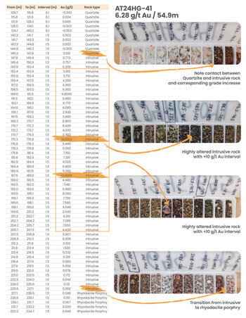 Figure 6. Full assays released today of the mineralized interval in AT24HG-41 show the consistency of high-grade gold throughout the entire mineralized zone. Consistent distribution of high-grade seen in this hole is a great indication of a strong gold system. The quartzite cap above the mineralization likely aided in concentrating gold deposition in the underlying intrusive rocks, thus pointing to a strong possibility of encountering similar mineralization further southward along the SQRT. (CNW Group/Nevada King Gold Corp.)
