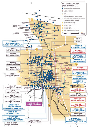 - The oxide gold in AT24HG-41 is hosted within an intrusive suite consisting of variably silicified and argillized rhyolitic dikes and adjacent rhyolite-dominated explosive tuff dike breccia bodies. The sustained, consistent high gold grades seen in these intrusive units are very unusual at Atlanta, and when compared to the intrusive-hosted mineralization seen in holes further north along the WAGZ, the much higher grades encountered in AT24HG-41 demonstrate an abrupt southward strengthening of gold mineralization. Today's hole demonstrates that felsic intrusive rocks at Atlanta are capable of hosting a type of high-grade mineralization that can potentially produce a significant gold system more akin to Kinross Gold's large gold mine at Round Mountain, Nevada (located 240km west of Atlanta and with 16 million ounces of gold produced through 2022 - Source: USBM Nevada Mineral Explorer Website, 2023). This potential certainly applies to the SQRT, and beyond that, the many low resistivity zones (a few of which are shown in Figure 4) revealed by the CSAMT data also constitute valid exploration targets hosting similar high-grade potential across the Atlanta District.