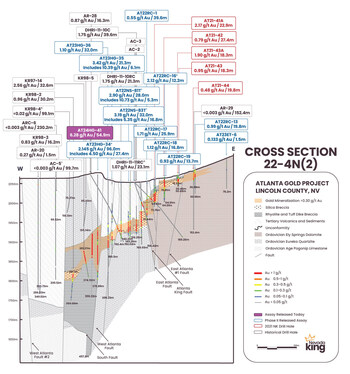 Figure 3. Cross section 22-4N(2) looking north across the West Atlanta Fault that divides the AMFZ target on the east from the WAGZ target on the west. Hole AT24HG-041 drilled down through a dense quartzite cap and into mineralized felsic intrusions emplaced along the West Atlanta Fault. CSAMT data indicates a southward extension to this intrusive zone. (CNW Group/Nevada King Gold Corp.)