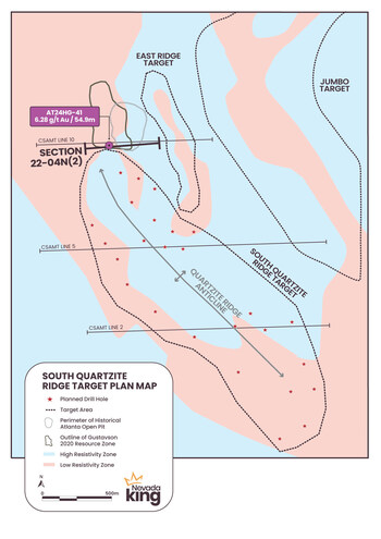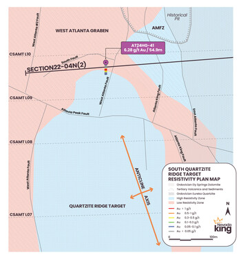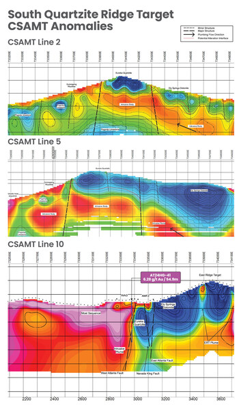 Cal Herron, Exploration Manager of Nevada King, stated, "I cannot over-emphasize the significance of AT24HG-41 – in my opinion, it is the most important hole Nevada King has drilled to date at Atlanta. Higher-grade intervals have been hit including previously released AT23WS-44 (11.64 g/t Au over 108.2m), but this and other holes conform to our previous interpretation of high-grade gold mineralization focusing in intensely silicified intersections of faults. In contrast, the 54.9m @ 6.28 g/t Au in AT24HG-41 occurs within variably silicified-argillized aphyric rhyolite and fine-grained porphyritic rhyolite tuff dike breccias possessing very sparse quartz veinlets. These rocks are pervasively altered and the gold appears to be disseminated within the groundmass and/or concentrated in loose oxides or fractures. There is no evidence of significant quartz veining or strong faulting seen in the cuttings. We believe that gold mineralization was coeval (having the same age) with the felsic intrusions and became trapped beneath the massive quartzite cap along the South Quartzite Ridge anticlinal axis. These felsic gold hosts are easily tracked southward from AT24HG-41 by the consecutive sequence of low resistivity anomalies shown along CSAMT lines 2, 5, and 10 (Figure 5) underneath the strongly resistive quartzite cap. Gold enrichment is most likely to occur within the axial plane region of the anticline, which would move our actual drill targets in closer to the centre of the anticline, meaning we need to drill along the crest of the Quartzite Ridge or from positions near the crest.