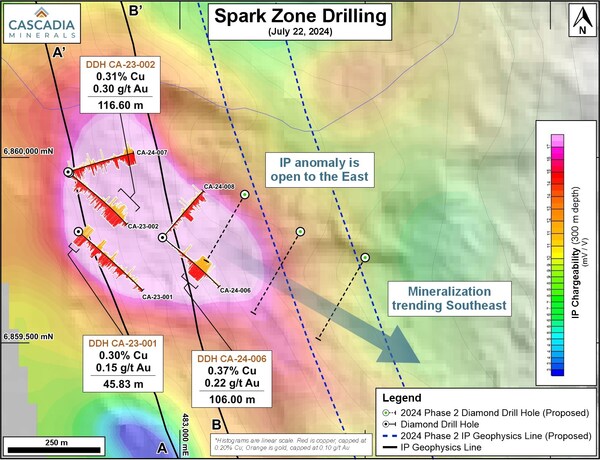 "To have stepped out over 300 m from our discovery hole at the Spark Zone and hit higher grade copper over a significant width is incredibly positive and a testament to the size and strength of the system. All three of the holes drilled this spring achieved our goal of intersecting porphyry copper-gold mineralization and critical alteration data, which will help us vector towards the core of the system and target broader zones of higher grade potassic alteration," said Graham Downs, Cascadia's President and CEO. "Phase two exploration is now underway to drill step-out holes further to the southeast, in the direction of higher-temperature alteration. New, grassroots porphyry discoveries in North America are very rare, and typically take dozens of holes to vector towards the core of the system. We've just caught the tip of the iceberg at Catch and look forward to continuing to unlock this district-scale porphyry opportunity."