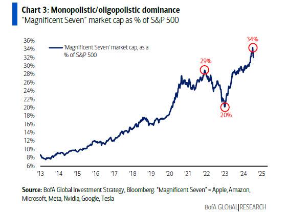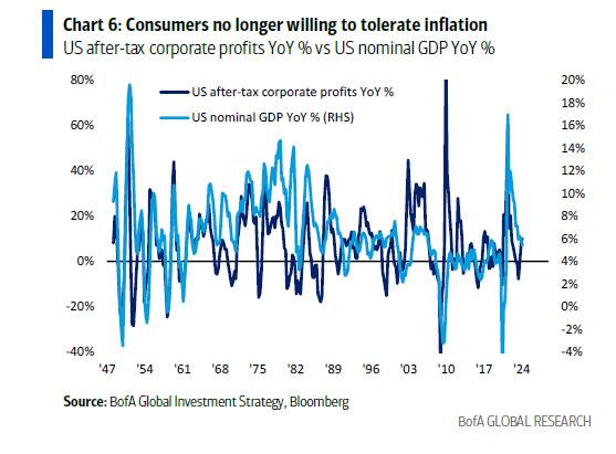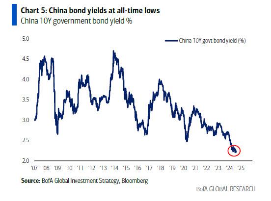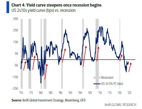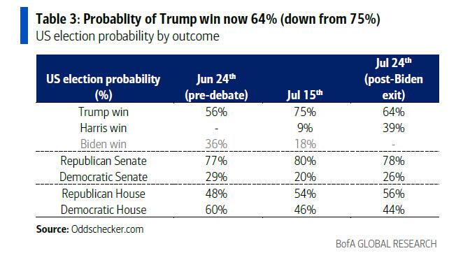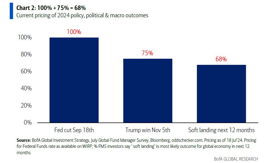 Read Replies (1) | Respond to of 455794 Hartnett: The World's Most Crowded Trades Are Getting Liquidated And here are the key levels to hold to confirm the correction is "healthy"... And while many bulls have argued the correction was healthy, Hartnett warns that key levels that must hold are the following: yen (JPY) 152, copper (HG1) 9000, tech (NDX) 18700. Those same bulls will also say that as long as these levels hold, this will be just another dip-buying opportunity as some of the froth clears out; that's because - as Hartnett wrote last week - investors had fully priced-in the bullish combo of Fed cut (100%), Trump victory (75%), and soft landing (68%)... [url=] [/url]... and critically credit spreads - the "glue" for Wall St - have thus far been well-behaved… but this changes if IG CDX spreads (51bps) break above 60bps. Meanwhile, the bears will counter that a steeper yield curve is recessionary... [url=] [/url] ... that bond vigilantes won’t allow Fed cuts to work (since US debt is up $2tn past 317 days to $35tn)... [url=] [/url] ... consumers are no longer willing to tolerate inflation (lower nominal GDP = lower not higher EPS)... [url=] [/url] ... commodity prices confirm global economy ill (China bond yields at all-time lows)... [url=] [/url] ... and we are one bad payroll away from cracking monopolistic/oligopolistic dominance. [url=] [/url] Perhaps, but for now investors continue to flee cash and allocate to risky assets expecting the Fed to cut if not next week then definitely in September, and the latest weekly fund flows confirm it: according to EPFR data cited by Hartnett, the last week saw $22.2BN to equities, $16.1BN to bonds, $1.3BN to gold, $1.2BN to crypto... and $42.3BN out of cash, as investors start to frontrun the coming rate cuts. And while cash saw its largest outflow in 3 months, the following inflows were especially notable:Gold: biggest 2-week inflow since Mar'22 ($1.3bn this week – Chart 7); [url=] [/url]IG bonds: 39th week of inflows ($8.8bn this week) EM equities: largest inflow since Feb'24 ($11.1bn) China: largest inflow since Feb'24 ($8.3bn) Japan: largest inflow in 3 months ($4.1bn) Yet while markets keep pressing continued risk-on trades, Hartnett won't tired of doing just the opposite, and echoing what he has said for much of 2024, he remains bullish on bonds in the second half of 2024 as the contrarian reversals of the first half's ABB "Anything But Bonds" trades continue to outperform, to wit:"leverage" (REITs, small cap), "value" (e.g. UK FTSE…the "anti-Nasdaq"), "duration" (e.g. biotech); ... but the black swan - as Hartnett himself admits - is that the fiscal excess of 2020s can flip cyclical bond bull script. That said, if the coming recession and spike in unemployment cause higher government bond yields as markets discount a fiscal policy panic to avert social & political unrest, e.g. politicians tell Fed to fund deficit and address AI-led unemployment via QE or yield curve control (AI = UBI = YCC), and Fed cuts in H2 and yields rise vs. fall, this will all be hugely bullish crypto/commodities, and hugely bearish US dollar. Hartnett concludes his latest note by discussing the latest weekly political trends, where we have seen the probability of a Trump win drop to 64% (was 75% last week)... [url=] [/url]