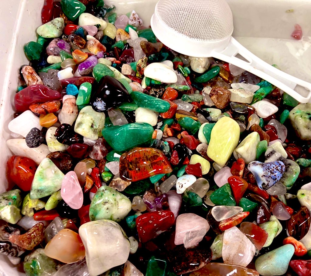 It looks wet because it has cutting oil on it. After I polish it. It will look just like the picture. The rock is called Chrysocolla. I’ve also been tumbling a lot of stones. I made this rock case for my granddaughter.