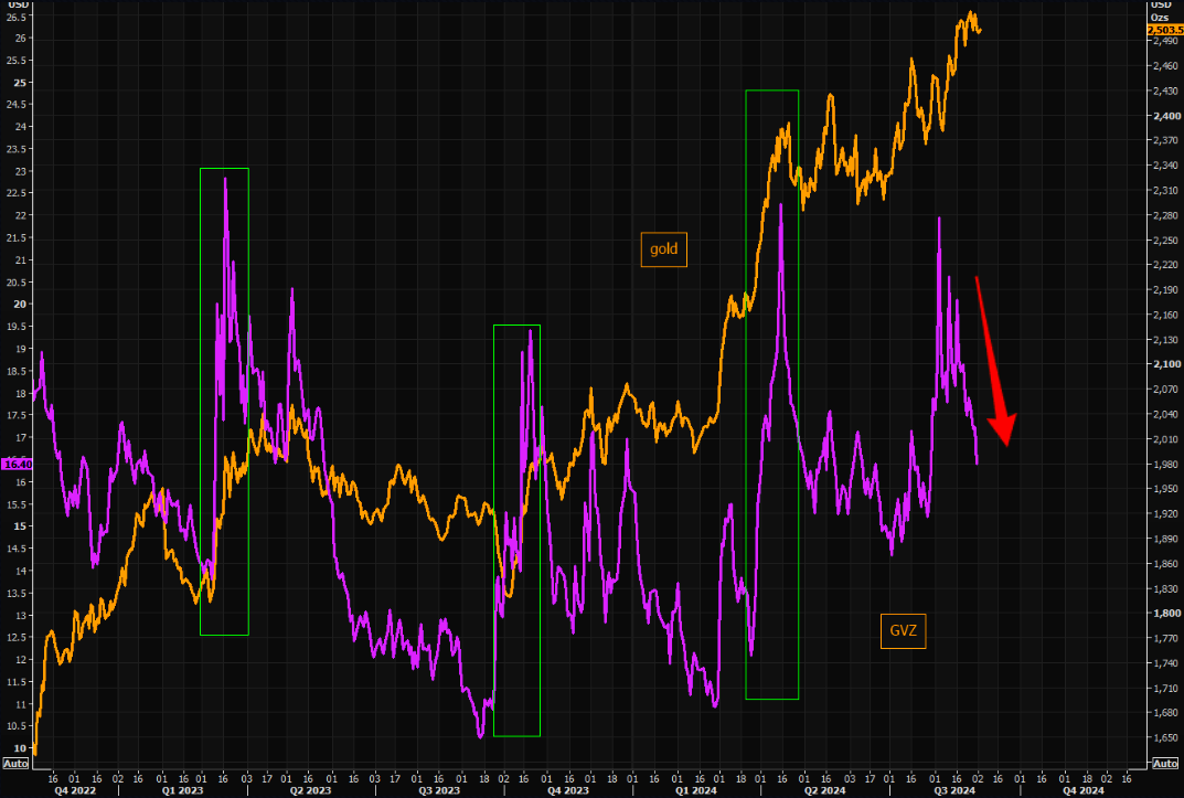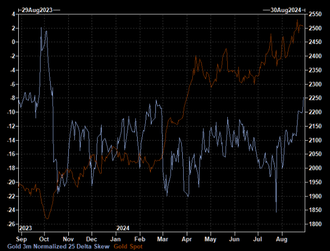To: bull_dozer who wrote (207685 ) 9/7/2024 1:46:48 AM From: TobagoJack Respond to of 219931 Re << THE F*CKING F*CK >> BTW, shared breakfast this morning with a new acquaintance, an ex-goldman trader, and fwiw, which might be not very much, but he has been since 2021 and is still accumulation gold. He is hesitating on oil.zerohedge.com Goldman Going For Gold BY THE MARKET EAR TUESDAY, SEP 03, 2024 - 18:11Waiting for the break-out Gold has continued moving higher, but the pace is not overly impressive. This looks like a rising wedge, something you see when strong trends start to fade. Let's see how this plays out, but gold bulls must see the metal climb above the upper trend line rather soon. Source: Refinitiv Goldman goes for Gold "In this softer cyclical environment, gold stands out as the commodity where we have the highest confidence in near-term upside. More specifically, we maintain our bullish $2,700/toz target for early 2025 and we open a long gold trading recommendation for three reasons: 1. We believe that the tripling in central bank purchases since mid-2022 on fears about US financial sanctions and US sovereign debt is structural and will continue, reported or unreported. 2. Imminent Fed rate cuts are poised to bring Western capital back into the gold market, a component largely absent of the sharp gold rally observed in the last two years. 3. Gold offers significant hedging value to portfolios against geopolitical shocks including tariffs, Fed subordination risk, and debt fears." (Goldman Sachs)15% upside "Our analysis suggests an upside of 15% in gold prices under a hypothetical rise in financial sanctions equal to the rise seen since 2021 and a similar upside if US CDS spreads widen by 1 standard deviation (13bps) amid rising debt concerns." (Goldman)Central Bank buying Goldman continued: "We see value in long Gold positions given higher Central Bank demand and hedging value against geopolitical/financial shocks (sanctions, debt fears, tariffs, Fed subordination risk)" Source: Goldman Source: Goldman Not what gold volatility does Strong upside momentum in gold is usually accompanied with gold volatility moving higher (gold trades with an upside skew). We have seen the inverse lately, gold volatility moving substantially lower. One way to play Goldman's bullish gold logic is using relatively cheap uspide calls. Source: Refinitiv Gold longs - look at options Beware the "warning signal" from the options market. Goldman's Quinn writes: "In late October, when skew traded near its current mark, spot Gold was ~$1900". Source: GS derivs