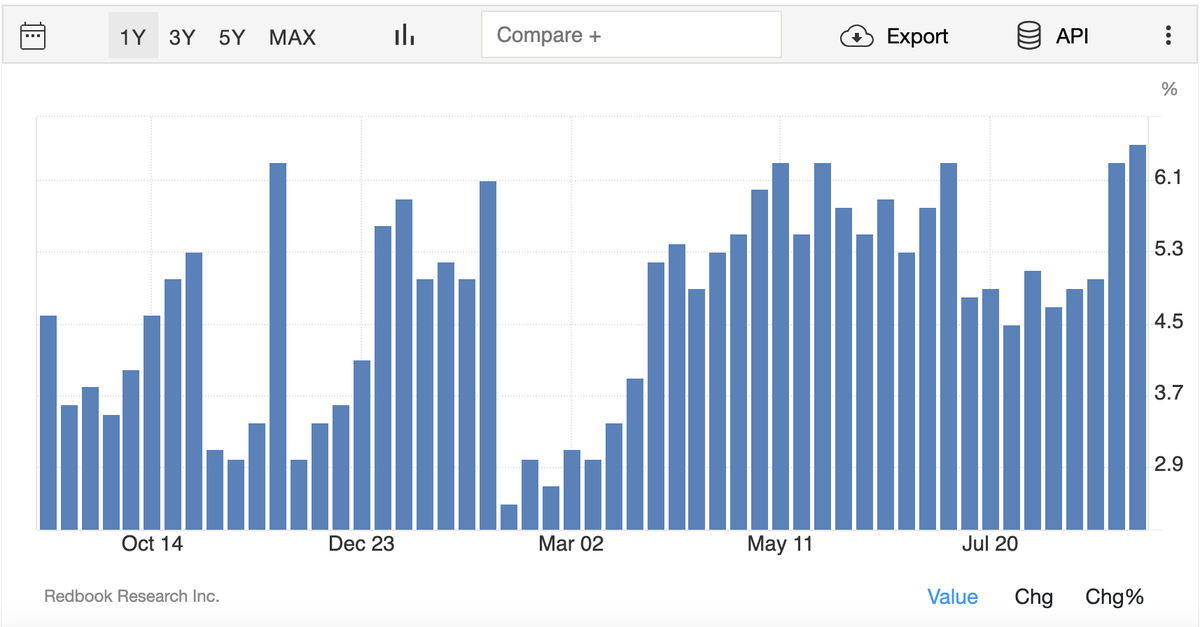 Redbook Retail Sales at highest Y/Y level in more than a year.